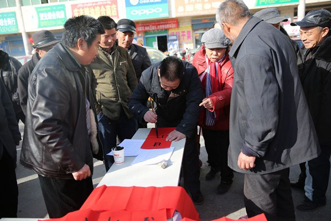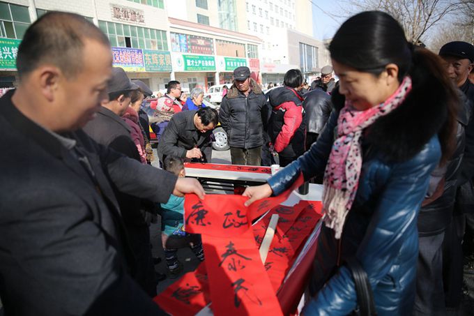 活动现场,书法老师们饱含着创作热情,挥毫泼墨,为我县居民送上羊年新春的第一份最美好的祝福。居民朋友们纷纷赶到书写春联现场,排着队等着拿大红的春联。居民们拿着春联,高兴的不得了,纷纷表示谢意与赞美。县书法协会的任青云老师说:“一副春联,一个福字,增添了年味不说,还弘扬了传统文化,非常有意义。”