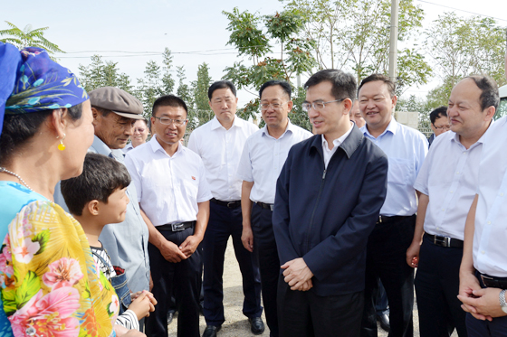 图为 9月11日,自治区党委常委、纪委书记罗东川来到尉犁县古勒巴格乡阿克其开村,与村民亲切交谈,了解他们的生产生活情况。(记者 杨晓东 摄)