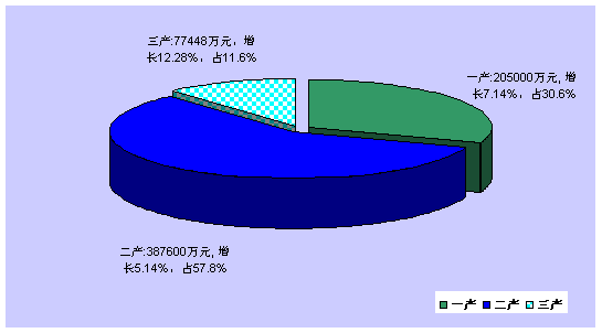 2015年,全县预计实现生产总值(GDP)670048万元,同比增长6.5%,其中:第一产业增加值205000万元,同比增长7.14%;第二产业增加值387600万元,同比增长5.14%;第三产业增加值77448万元,同比增长12.28%。三次产业比重30.6:57.8:11.6,第一产业比上年提高0.6个百分点,第二产业比上年回落2.6个百分点,第三产业比上年提高2个百分点。